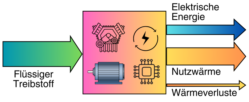 Ein Blockheizkraftwerk besteht aus einem Verbrennungsmotor, einer E-Maschine und der zugehörigen Leistungselektronik incl. Steuerung. Es wandelt die Energie des (regenerativ erzeugten) flüssigen Treibstoffs in elektrische Energie und Wärme um. Der größte Teil der Wärme wird dabei für Heizungen genutzt. Deswegen erreichen Blockheizkraftwerke sehr hohe Nutzungsgrade weit über 90 %. (Darunter versteht man das Verhältnis der in Form von mechanischer Energie und Wärme genutzter Energie im Verhältnis zur zugeführten Energie, also die „Ausbeute“.)